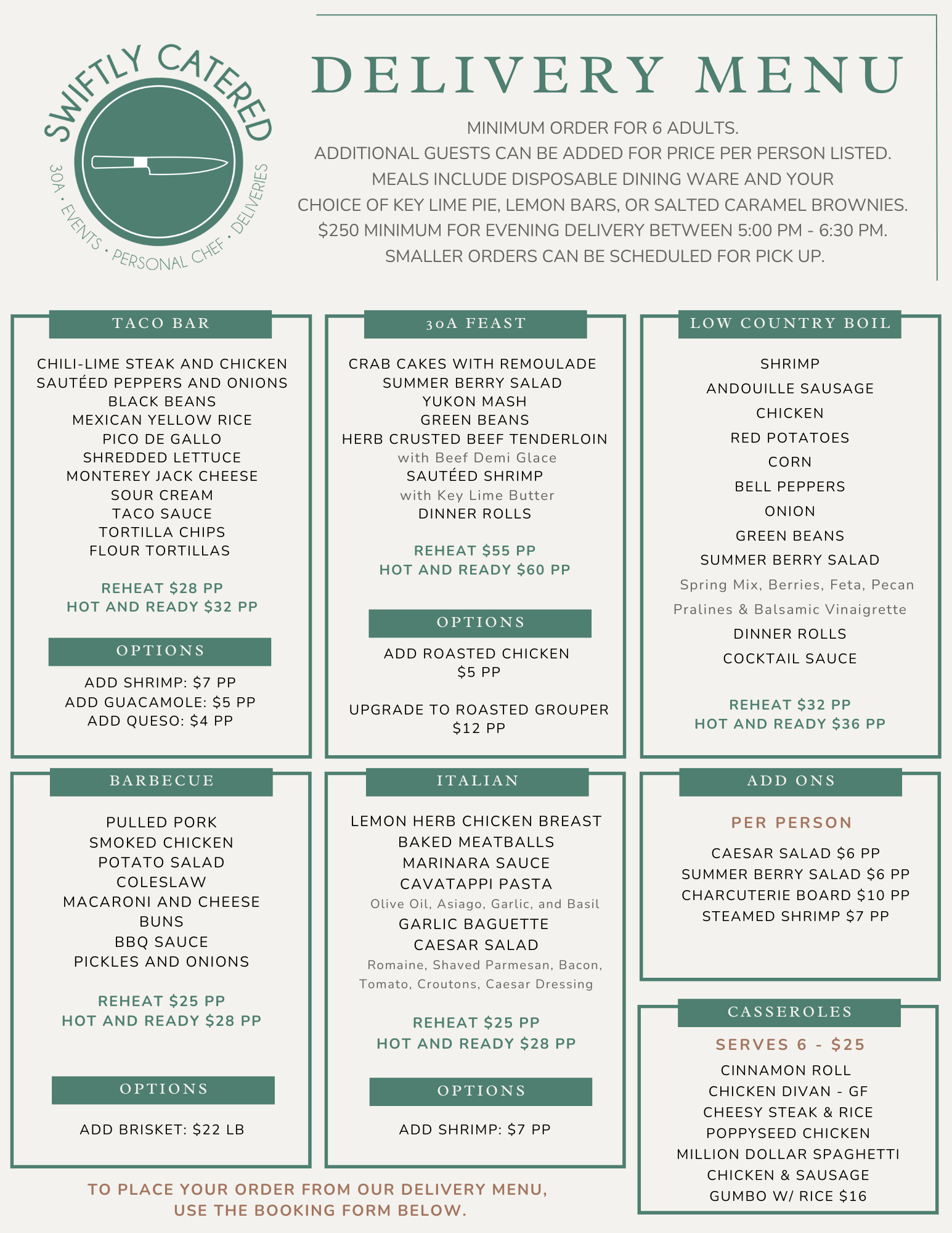 Meal packages start at 6 adult servings, additional guests can be added. There is a discount in place for ordering cold with reheat instructions. Stock the fridge and eat whenever you would like! Most meals reheat in under an hour and will hold in the fridge for 2-3 days.